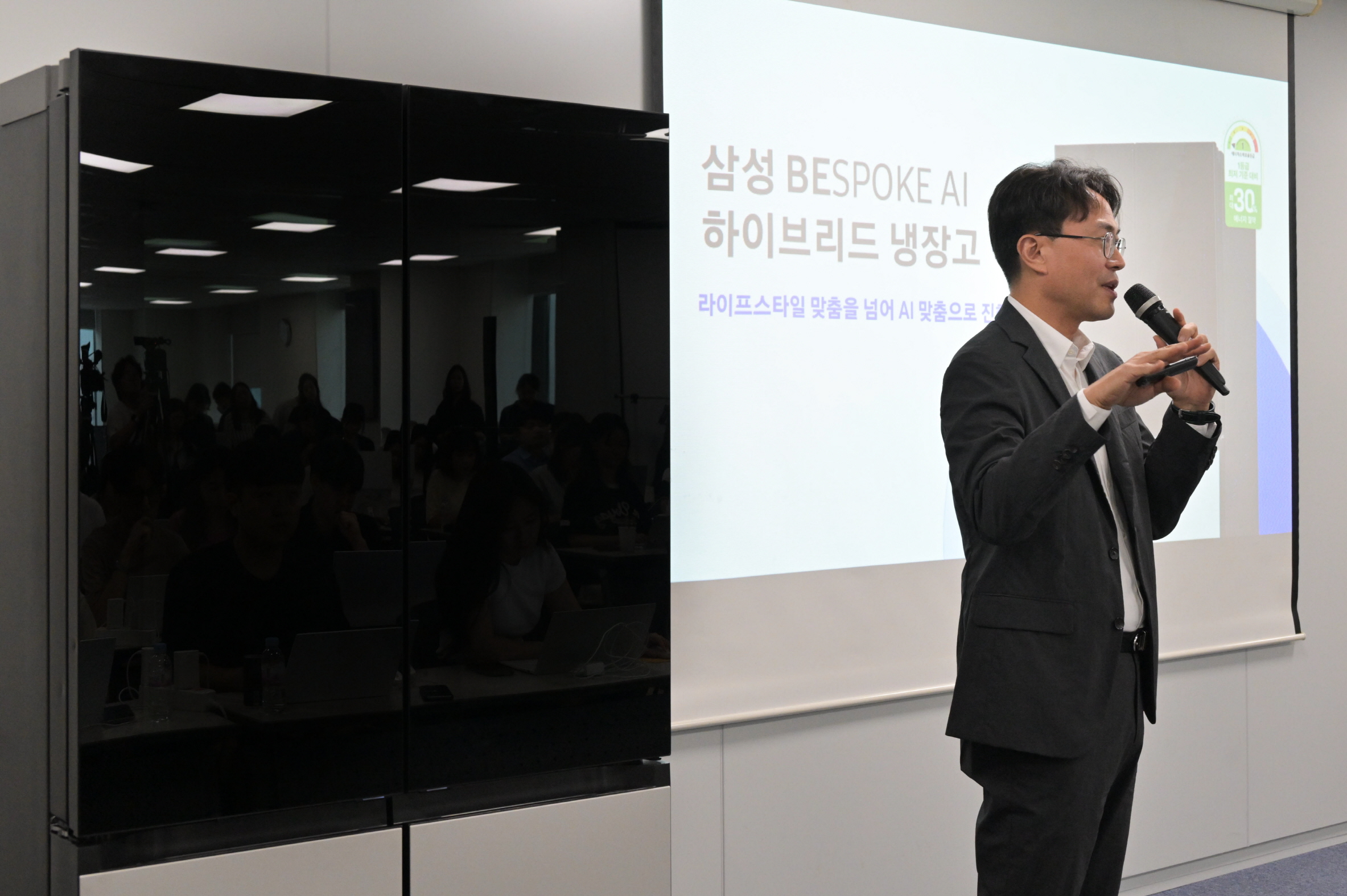 ▲ 삼성전자 냉장고 미디어 브리핑에서 삼성전자 선행개발팀 위훈 부사장이 ‘비스포크 AI 하이브리드’ 냉장고를 설명하고 있다.