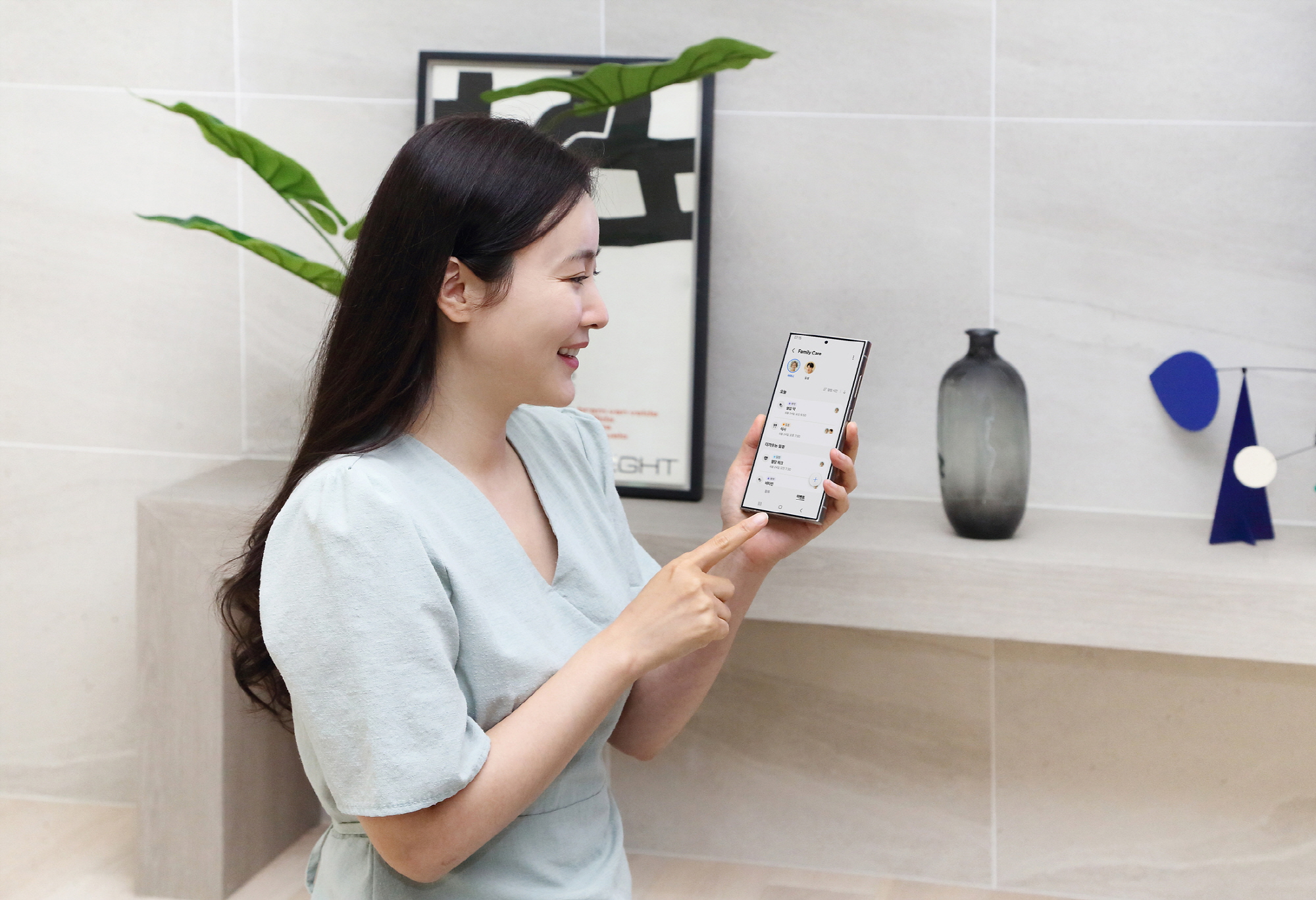 ▲ 삼성전자 모델이 부모님을 위한 AI 라이프 솔루션, 스마트싱스 ‘패밀리 케어’ 서비스의 복약시간 알림 등 ‘일정 관리’ 기능을 체험하고 있다. 사용자가 사전에 ▲약 복용 시간 ▲혈압‧혈당 측정 시간 ▲병원 예약 시간 등을 설정해 두면 부모님과 자녀 등 지정된 사용자의 스마트폰 또는 스마트TV로 알려줘 매우 유용하다.