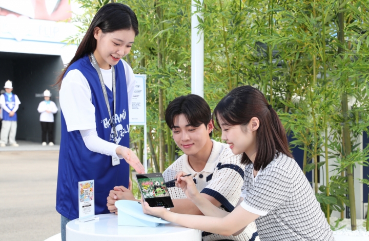 ▲ 에버랜드 바오패밀리 ‘갤럭시 Z 폴드6·Z 플립6’ 체험존에서 방문객들이 ‘갤럭시 Z 폴드6’와 ‘S펜’으로 바오패밀리 생일 축하카드를 만들고 있는 모습