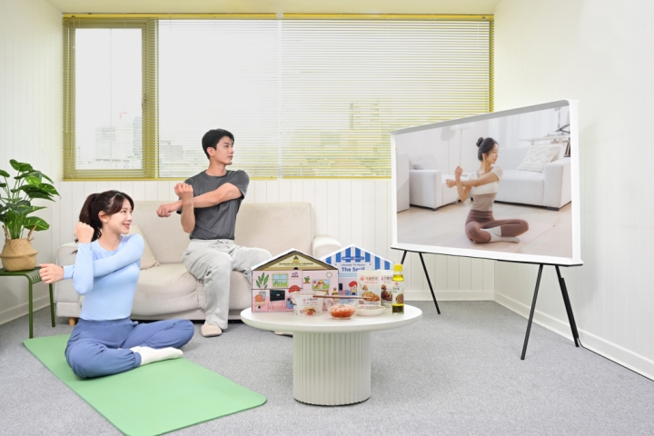 ▲ 삼성전자 모델이 더 세리프로 홈트 영상을 시청하며 ‘삼성 라이프스타일 TV 하우스 with 옐로우즈’ 패키지를 즐기고 있다.