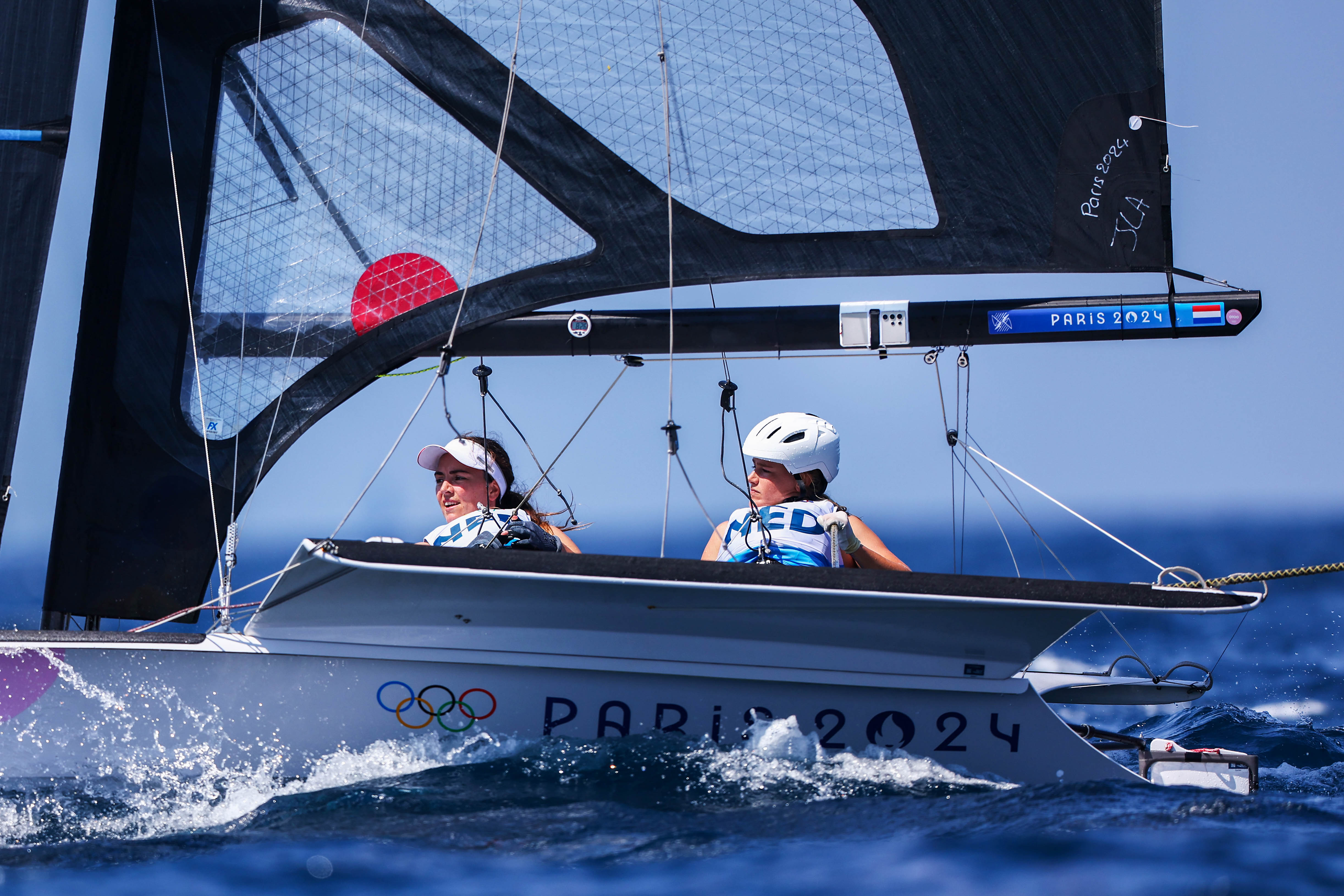 ▲8월 2일(현지시간) 프랑스 마르세유(Marseille)에서 열린 2024 파리 올림픽 여자 스키프에 출전한 오딜 앤홀트(Odile Aanholt, 네덜란드)와 애넷 두에츠(Annette Duetz, 네덜란드)선수의 요트에 ‘갤럭시 S24 울트라’가 설치된 모습