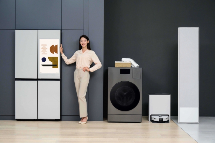 ▲ 삼성전자 모델이 인공지능(AI) 음성비서 ‘빅스비(Bixby)’가 적용돼 음성 명령으로 더욱 손쉽게 제어할 수 있는 ‘비스포크 AI 가전’을 소개하고 있다.