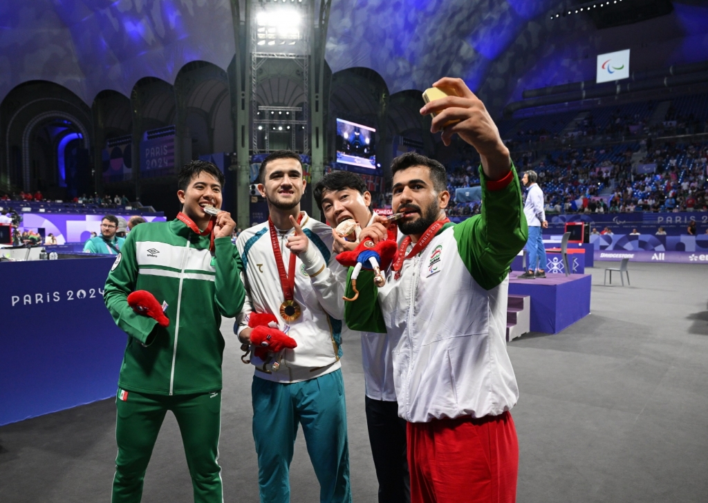 ▲ 8월 31일(현지시간) 프랑스 파리 그랑팔레(Grand Palais)에서 열린 2024 파리 패럴림픽 장애인 태권도 남자 -80kg급(스포츠등급 K44) 공동 취재구역(Mixed Zone)에서 은메달 루이스 나헤라(Luis Mario Najera, 멕시코), 금메달 아사드벡 토슈테미로프(Asadbek Toshtemirov, 우즈베키스탄), 동메달 주정훈(대한민국), 알리레자 바크흐트(Alireza Bakht, 이란) 선수가 갤럭시 Z 플립6 올림픽 에디션으로 빅토리 셀피를 찍고 있다.