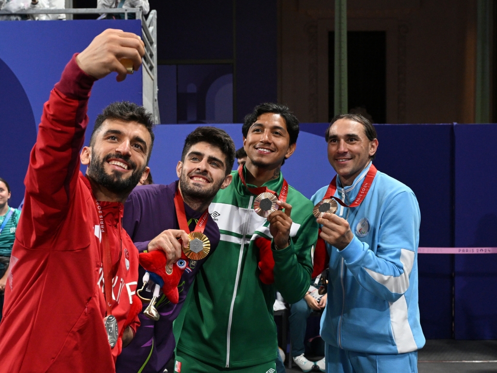 ▲ 8월 30일(현지시간) 프랑스 파리 그랑팔레(Grand Palais)에서 열린 2024 파리 패럴림픽 장애인 태권도 남자 -70kg급(스포츠등급 K44) 공동 취재구역(Mixed Zone)에서 은메달 파티흐 셀릭(Fatih Celik, 튀르키예), 금메달 이마마딘 칼리로프(Imamaddin Khalilov, 아제르바이잔), 동메달 후안 가르시아(Juan Diego Garcia Lopez, 멕시코), 후안 사모라노(Juan Eduardo Samorano, 아르헨티나) 선수가 갤럭시 Z 플립6 올림픽 에디션으로 빅토리 셀피를 찍고 있다.