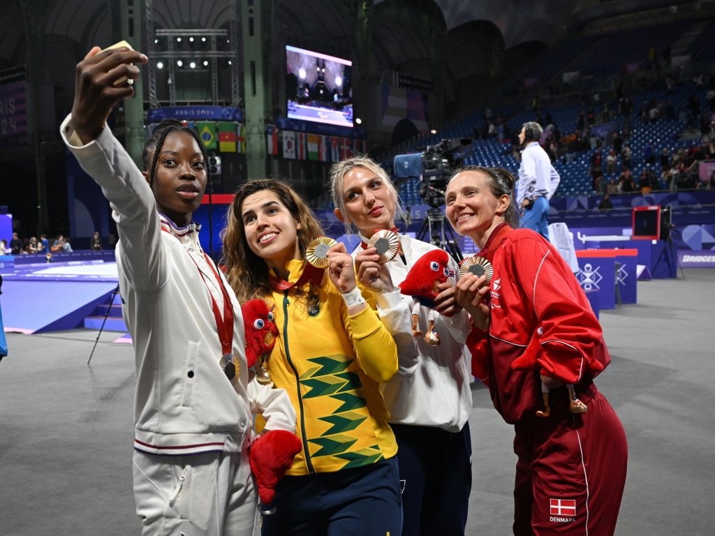 ▲ 8월 30일(현지시간) 프랑스 파리 그랑팔레(Grand Palais)에서 열린 2024 파리 패럴림픽 장애인 태권도 여자 -65kg급(스포츠등급 K44) 공동 취재구역(Mixed Zone)에서 은메달 젤리카 디알로(Djelika Diallo, 프랑스), 금메달 아나 카롤리나 시우바 드 모라(Ana Carolina Silva de Moura, 브라질), 동메달 크리스티나 그켄트주(Christina Gkentzou, 그리스), 리사 게싱(Lisa Kjaer, 덴마크) 선수가 갤럭시 Z 플립6 올림픽 에디션으로 빅토리 셀피를 찍고 있다.