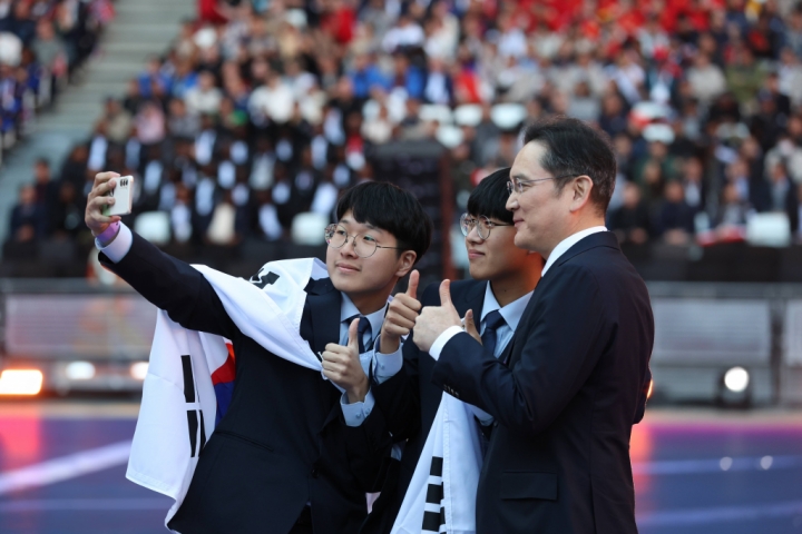 ▲ 15일(현지시간) 프랑스 리옹 소재 그루파마스타디움에서 열린 국제기능올림픽 폐회식에 참석한 이재용 회장이 메달 수상자들과 셀피를 촬영하는 모습