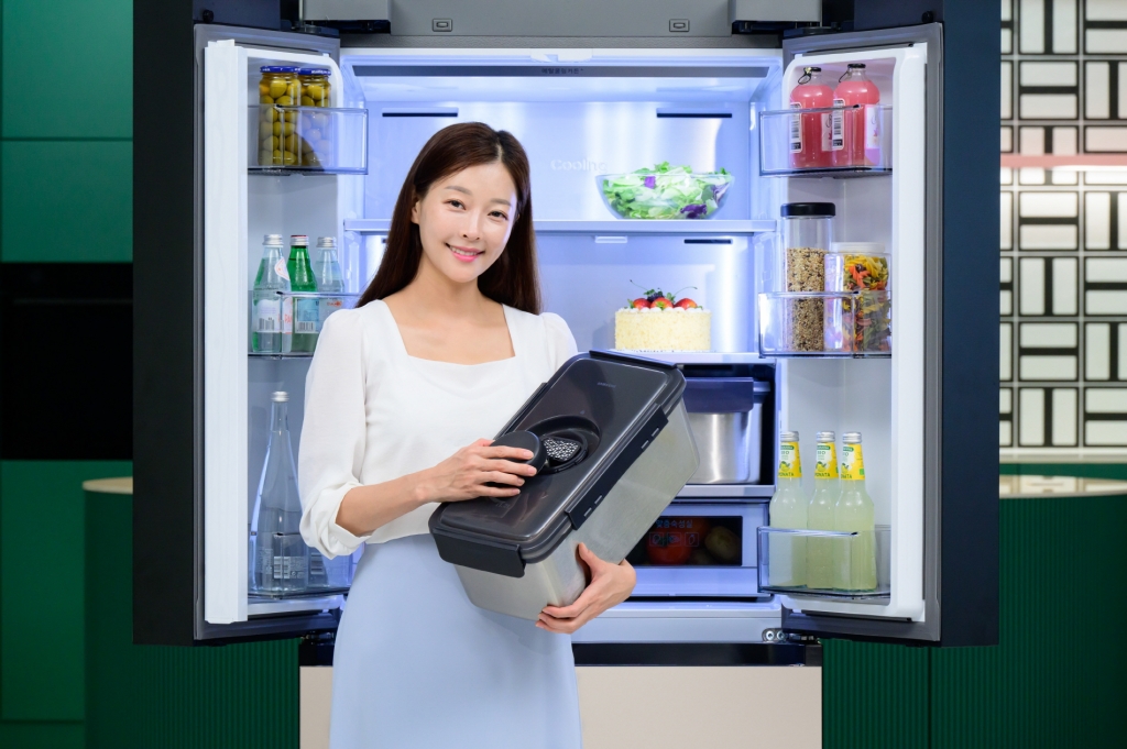 ▲ 삼성전자 모델이 ‘비스포크 AI 김치플러스’의 ‘냄새 케어 김치통’을 소개하고 있는 모습