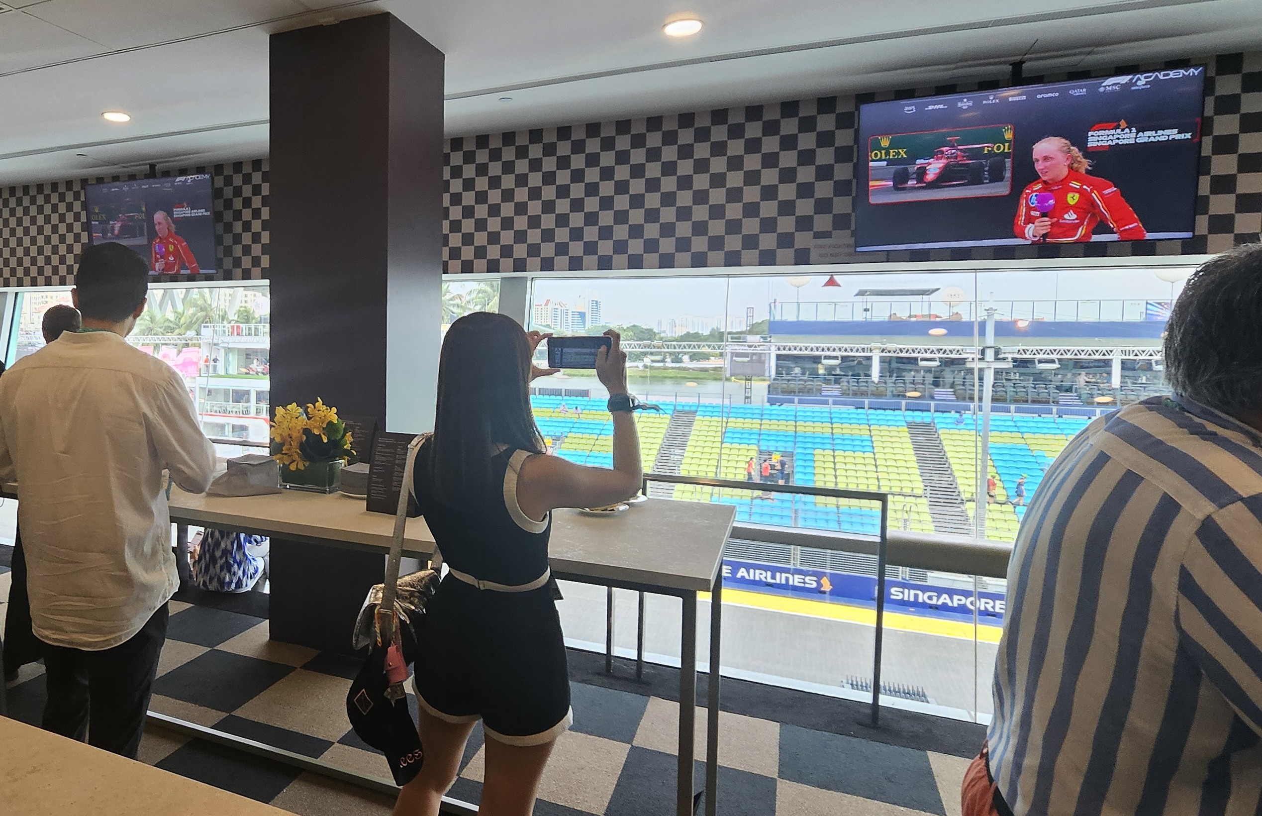 ▲ 9월 20~22일(현지시간) 싱가포르의 마리나 베이 스트리트 서킷에서 열린 ‘F1 싱가포르 그랑프리’에서 관객들이 실내 라운지인 패독 클럽에 설치된 삼성전자 TV를 통해 실시간으로 경기를 관람하고 있는 모습