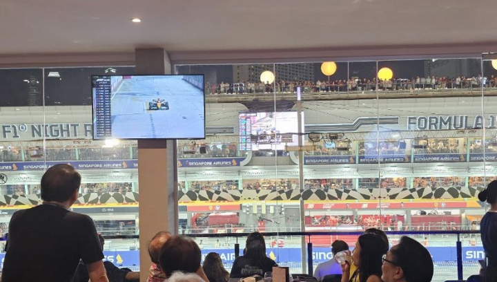 ▲ 9월 20~22일(현지시간) 싱가포르의 마리나 베이 스트리트 서킷에서 열린 ‘F1 싱가포르 그랑프리’에서 관객들이 실내 라운지인 스카이 스위트(Sky Suite)에 설치된 삼성전자 TV를 통해 실시간으로 경기를 관람하고 있는 모습