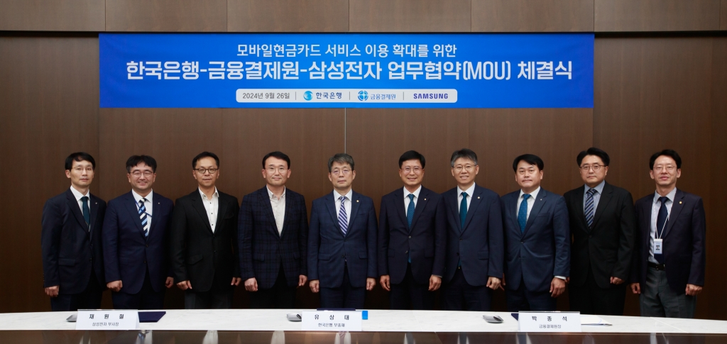 삼성전자가 한국은행, 금융결제원과 함께 서울 중구 한국은행 본관에서 삼성월렛에 모바일현금카드 서비스를 위한 업무 협약을 26일 체결했다.