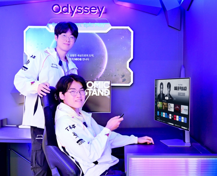 삼성전자가 26일 삼성스토어 홍대에서 T1 소속 프로게이머 ‘제우스’ 최우제 선수, ‘구마유시’ 이민형 선수를 초청해 삼성 게이밍 모니터 오디세이OLED 신제품 2종(G80SD·G60SD)을 체험하는 행사를 진행했다.