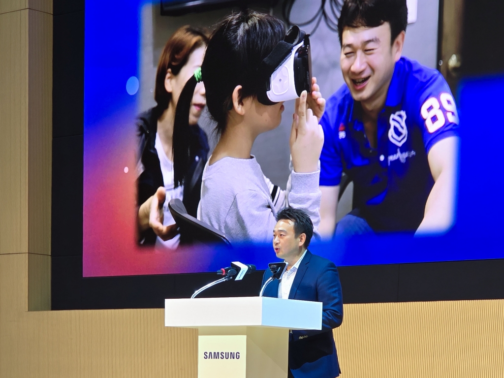 ▲ 삼성전자 수원 디지털시티에서 14일 열린 ‘2024 삼성 나눔의 날’ 행사에서 우수 재능기부 임직원으로 선정돼 ‘CSR 어워즈’를 수상한 삼성전자 강기재 프로가 소감을 말하고 있다.