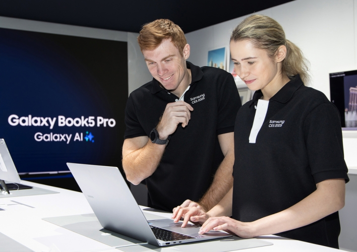 ▲ CES 2025가 열리는 미국 라스베이거스 컨벤션 센터에 위치한 삼성전자 전시관에서 삼성전자 모델이 ‘생산성을 높여주는 집’의 갤럭시 북5 시리즈를 소개하고 있다.