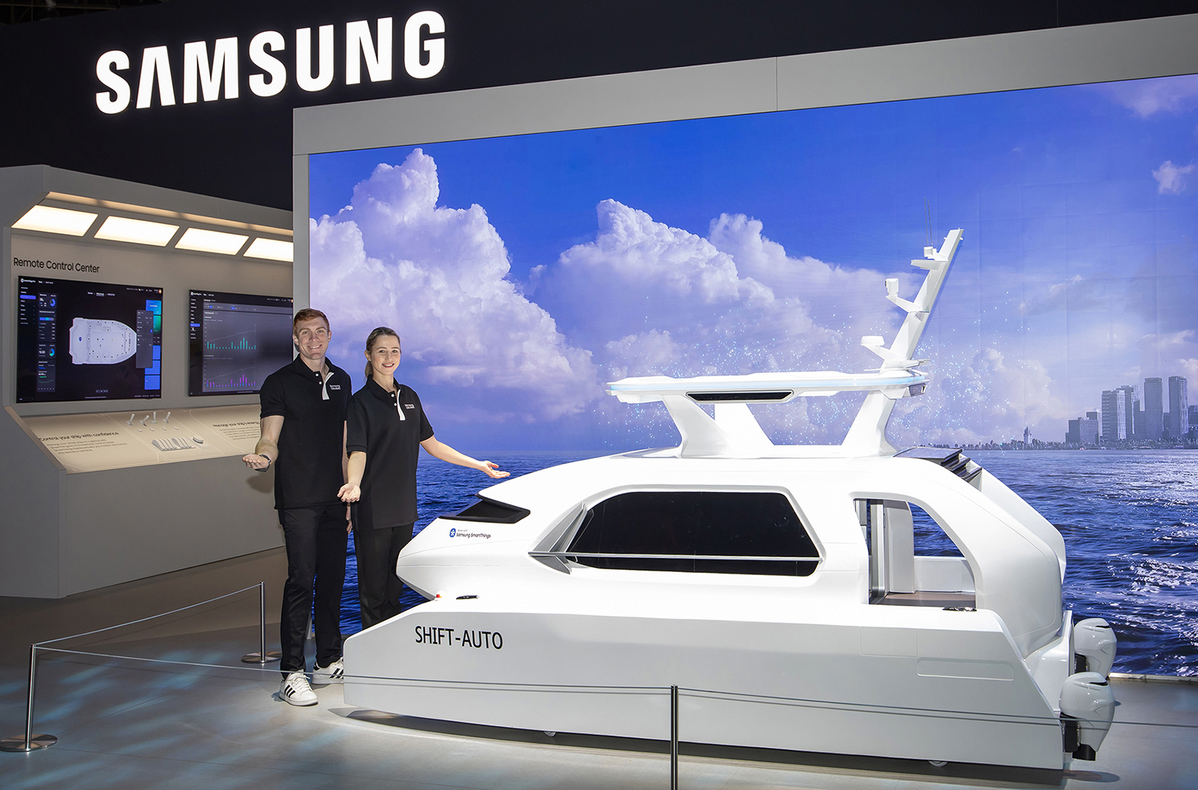 CES 2025가 열리는 미국 라스베이거스 컨벤션 센터에 위치한 삼성전자 전시관에서 삼성전자 모델이 스마트싱스를 사용한 '자율 항해 선박(Shift-Auto)'을 소개하고 있다.