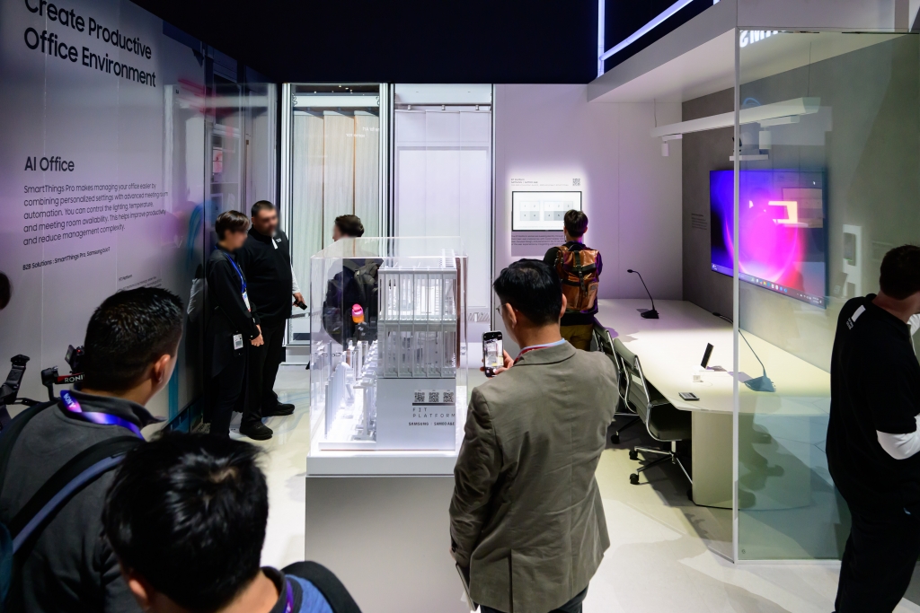 ▲ 업무 효율성과 지속 가능성을 동시에 충족시키는 ‘AI 오피스(AI Office)’. 안면 인식 솔루션을 통해 사람을 인식하고, 스마트싱스와 연결된 기기들이 회의실 환경을 제어한다