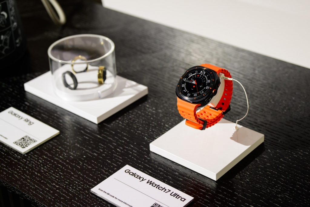 ▲사용자의 수면 데이터를 측정하는 갤럭시 링과 갤럭시 워치(사진 왼쪽), 갤럭시 워치 수면 무호흡 감지 기능 설명 벽면(사진 오른쪽). 사용자의 산소포화도를 토대로 수면 무호흡이 감지되면 갤럭시 디바이스에 ‘위험 감지’ 표시가 뜬다.