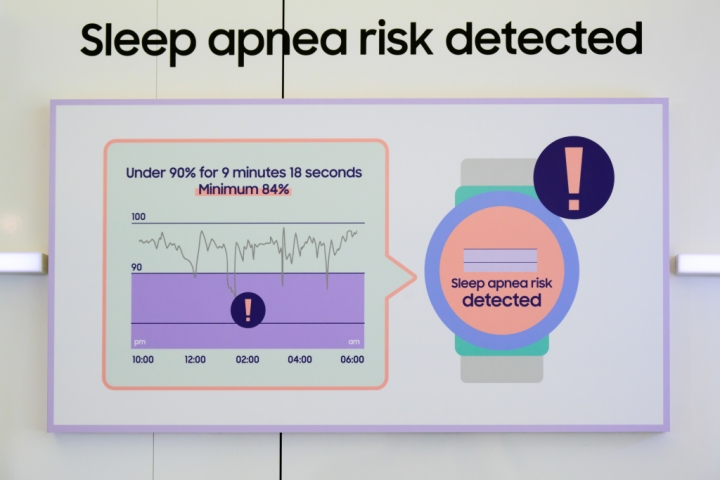 ▲사용자의 수면 데이터를 측정하는 갤럭시 링과 갤럭시 워치(사진 왼쪽), 갤럭시 워치 수면 무호흡 감지 기능 설명 벽면(사진 오른쪽). 사용자의 산소포화도를 토대로 수면 무호흡이 감지되면 갤럭시 디바이스에 ‘위험 감지’ 표시가 뜬다.