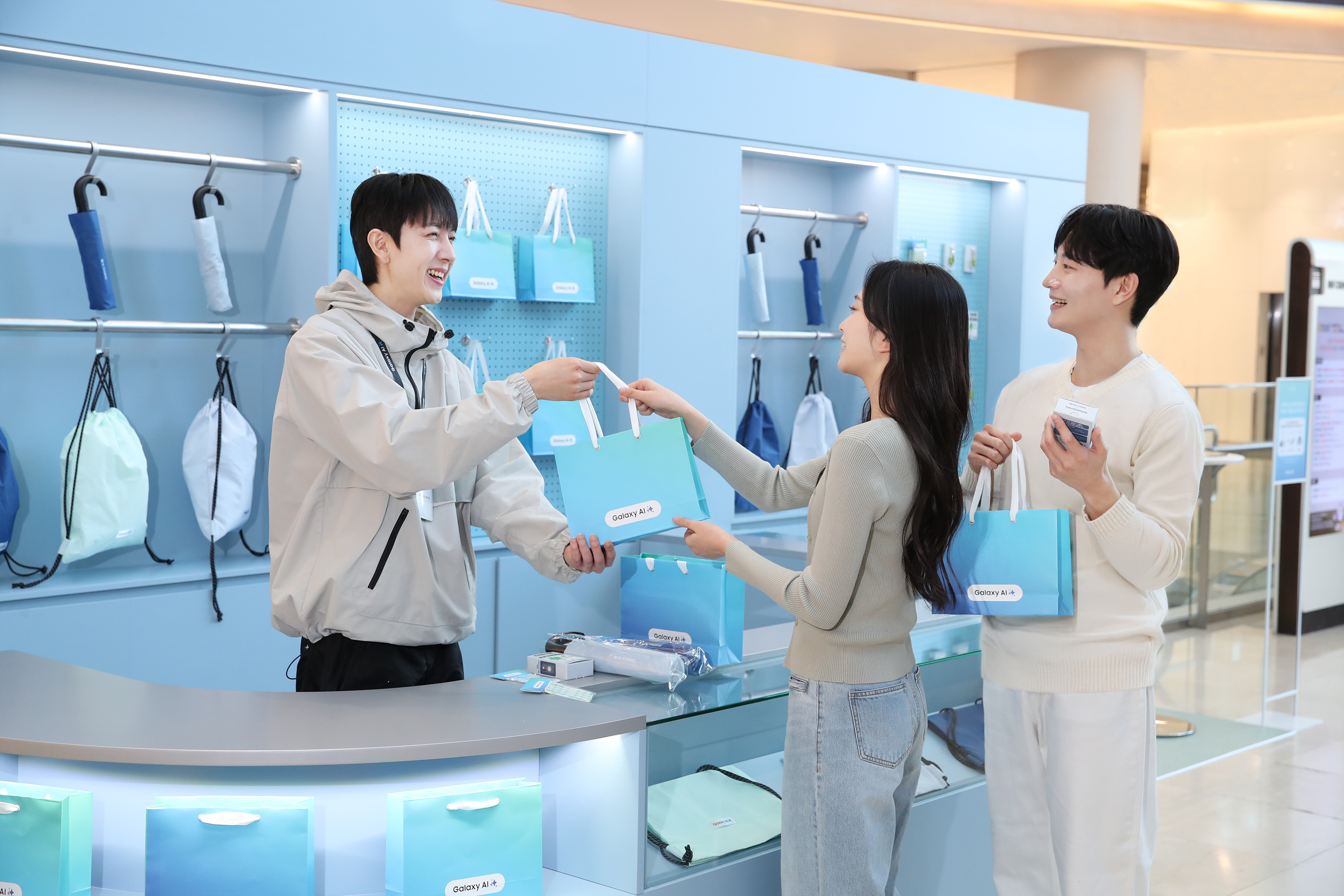 ▲ 23일 오픈한 서울 영등포구 타임스퀘어 ‘갤럭시 스튜디오’ 에서 방문객들이 미션을 완료하고 굿즈를 수령하는 모습
