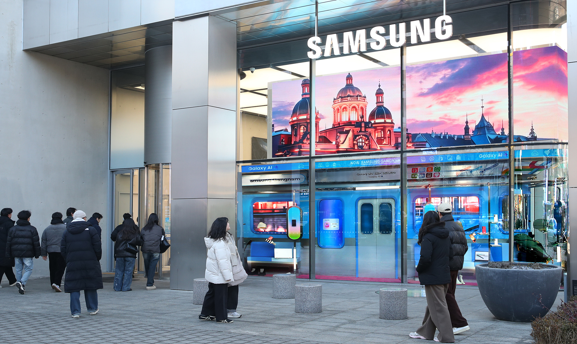 ▲ 삼성 강남 ‘갤럭시 스튜디오’의 지하철 콘셉트 디지털 파사드 전경