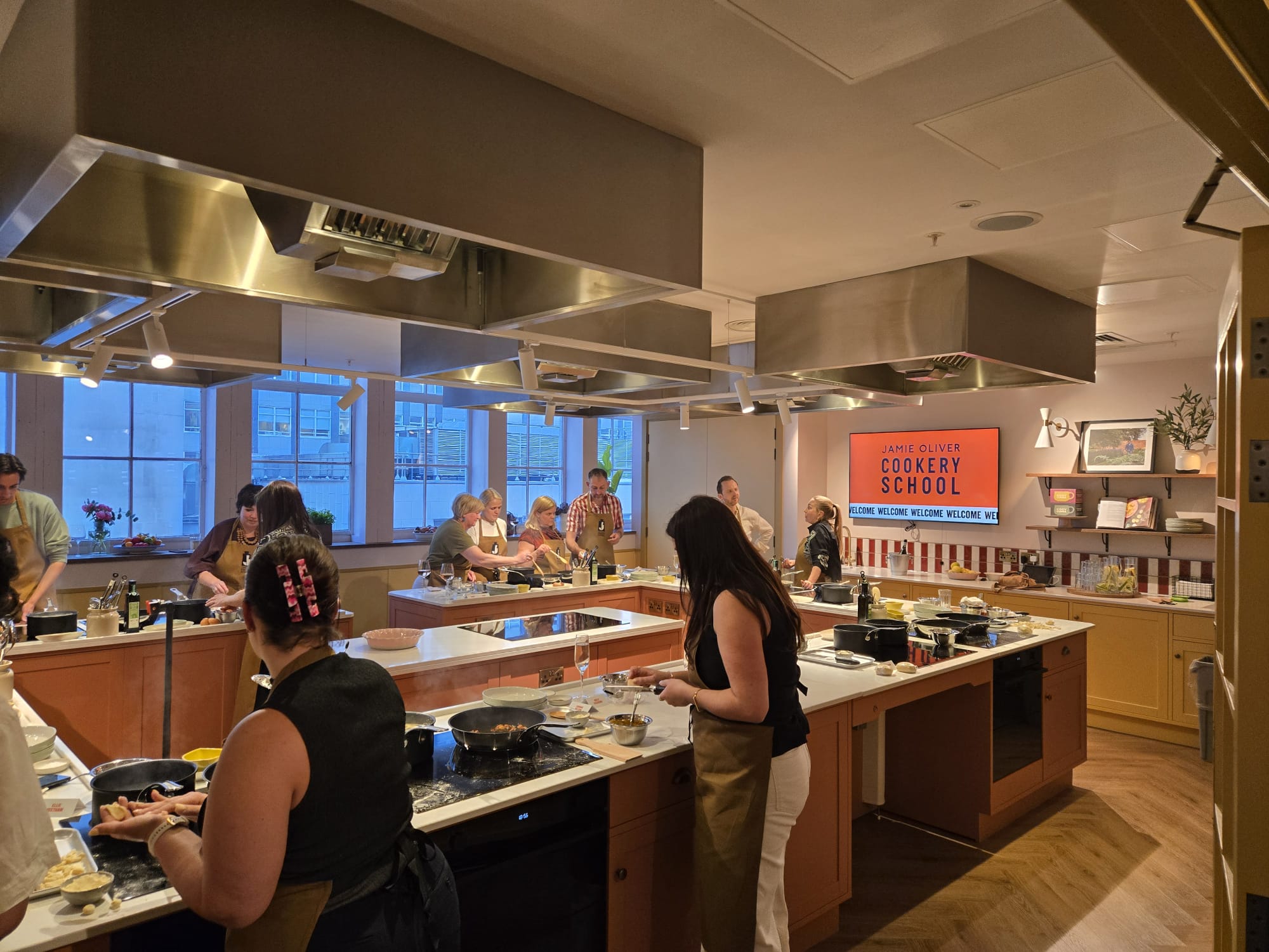 ▲ 삼성전자 비스포크 AI 주방가전으로 단장한 영국 런던 제이미 올리버의 키친 스튜디오에서 참가자들이 클래스를 체험하고 있다.
