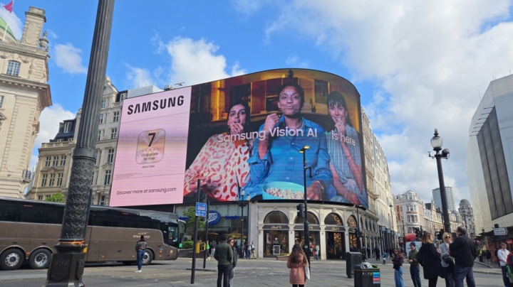 ▲삼성전자가 영국 런던 피카딜리 광장에서 진행하는 ‘삼성 비전 AI(Vision AI)’ 옥외광고 모습