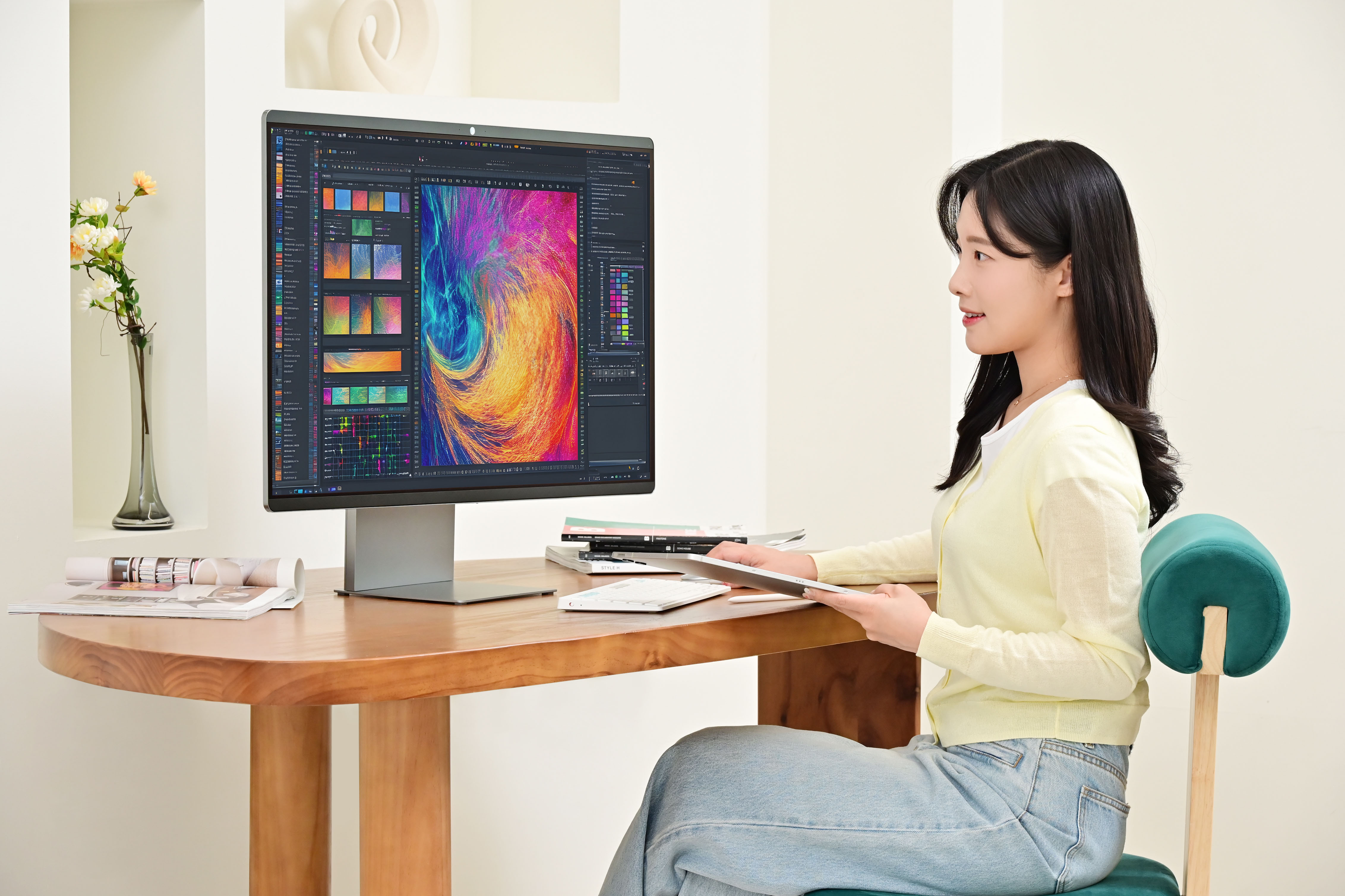 ▲ 삼성전자 모델이 글로벌 색상 전문 브랜드 팬톤의 컬러 인증을 받은 2025년형 삼성 스마트모니터 M9으로 컬러 디자인 작업을 하고 있다.