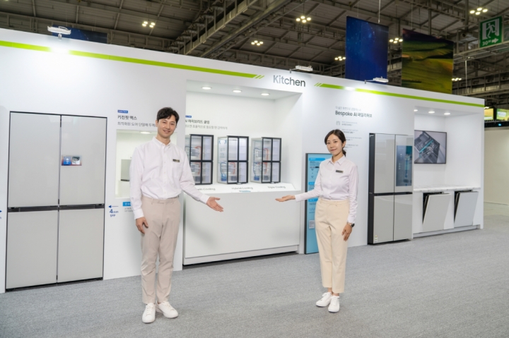 ▲ 삼성전자 모델이 25일부터 28일까지 광주광역시 김대중컨벤션센터에서 열리는 ‘2025 광주미래산업엑스포’ 삼성부스에서 삼성전자 키친존을 소개하고 있다.