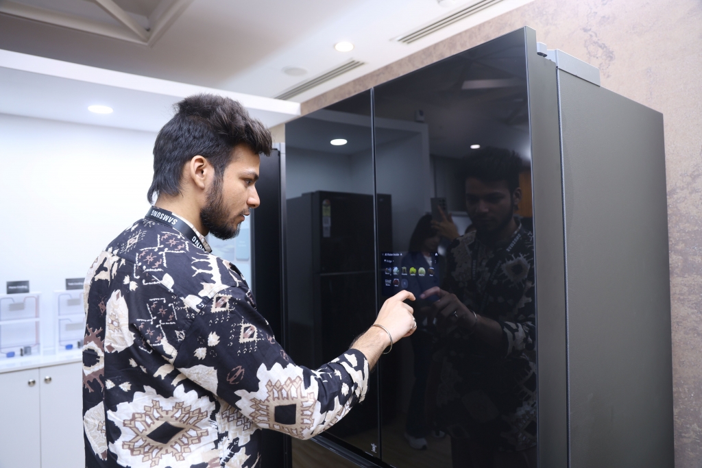 ▲ 인도 구르가온에서 열린 삼성전자 서남아 테크 세미나에서 참석자가 9형 터치스크린을 탑재한 ‘비스포크 AI 냉장고’를 체험하고 있다.