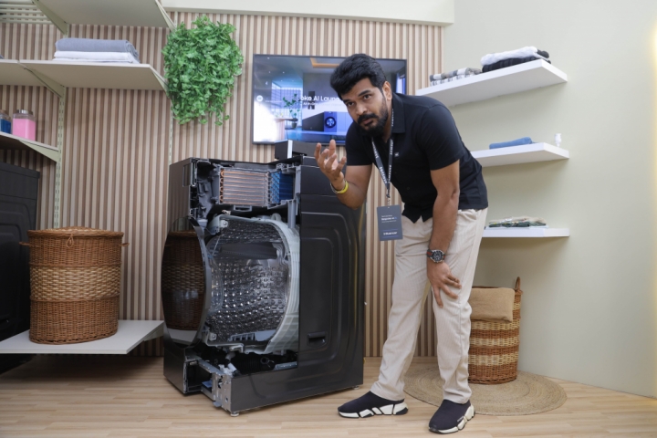 ▲ 인도 구르가온에서 열린 삼성전자 서남아 테크 세미나에서 참석자가 일체형 세탁건조기 ‘비스포크 AI 콤보’를 살펴보고 있다.