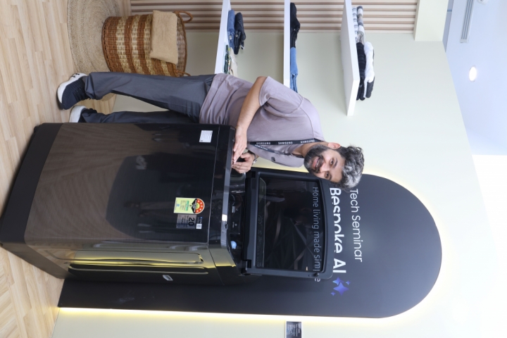 ▲ 인도 구르가온에서 열린 삼성전자 서남아 테크 세미나에서 참석자가 최신 AI 기능을 탑재한 삼성전자 '전자동 AI 통버블' 세탁기를 사용해보고 있다.