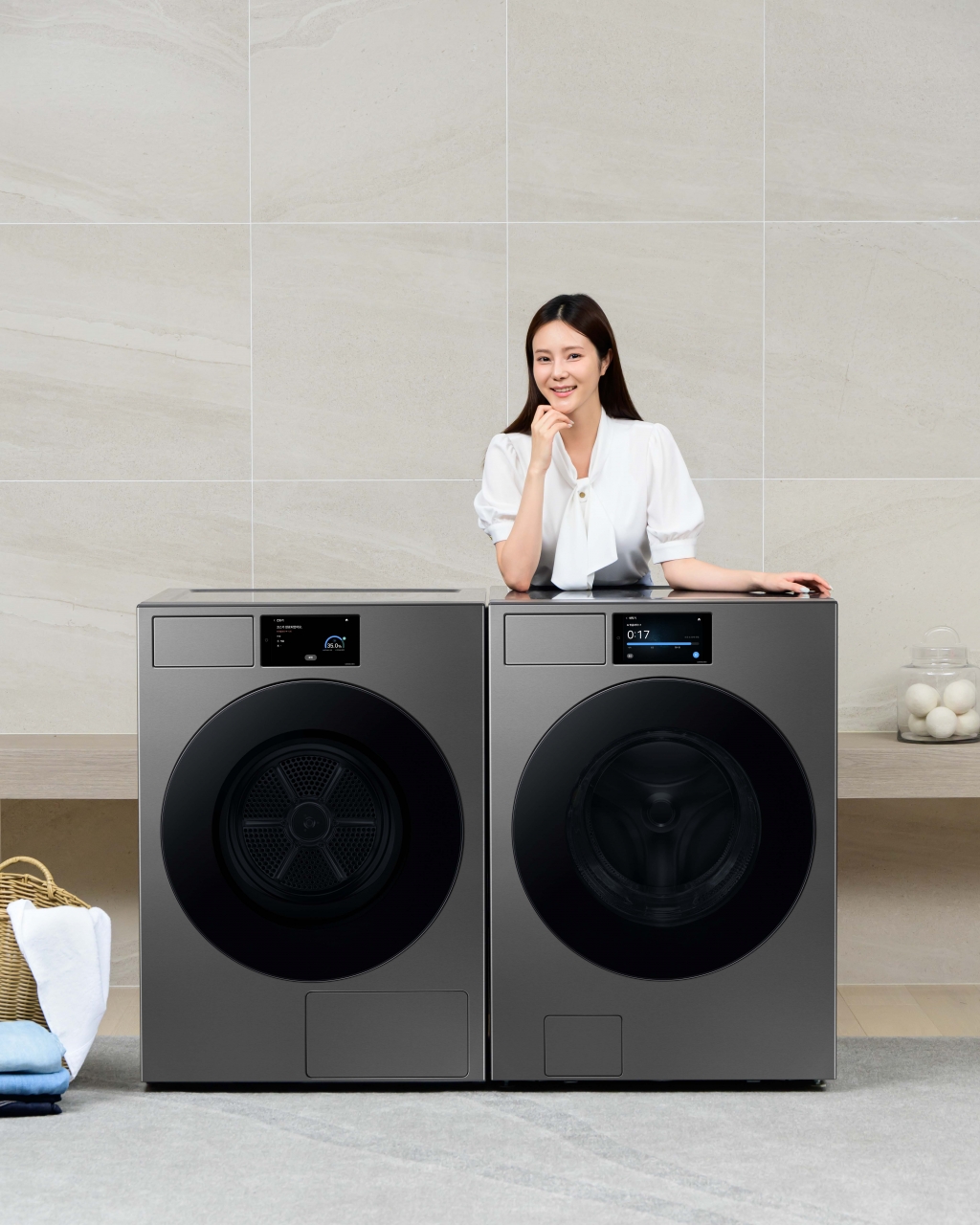 ▲ 삼성전자 모델이 7형 ‘AI홈’ 터치스크린을 탑재하고 한층 강화된 AI 기능도 제공하는 2025년형 ‘비스포크 AI 세탁기’와 ‘비스포크 AI 건조기’ 신제품을 소개하고 있다.