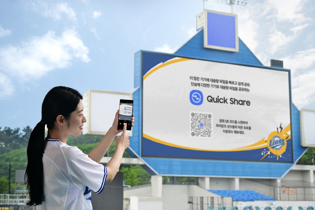 ▲ 대구 삼성 라이온즈 파크에서 방문객이 전광판에 송출되는 ‘QR코드’를 스캔해 선수들의 ‘히든 포토’를 다운로드 받는 모습