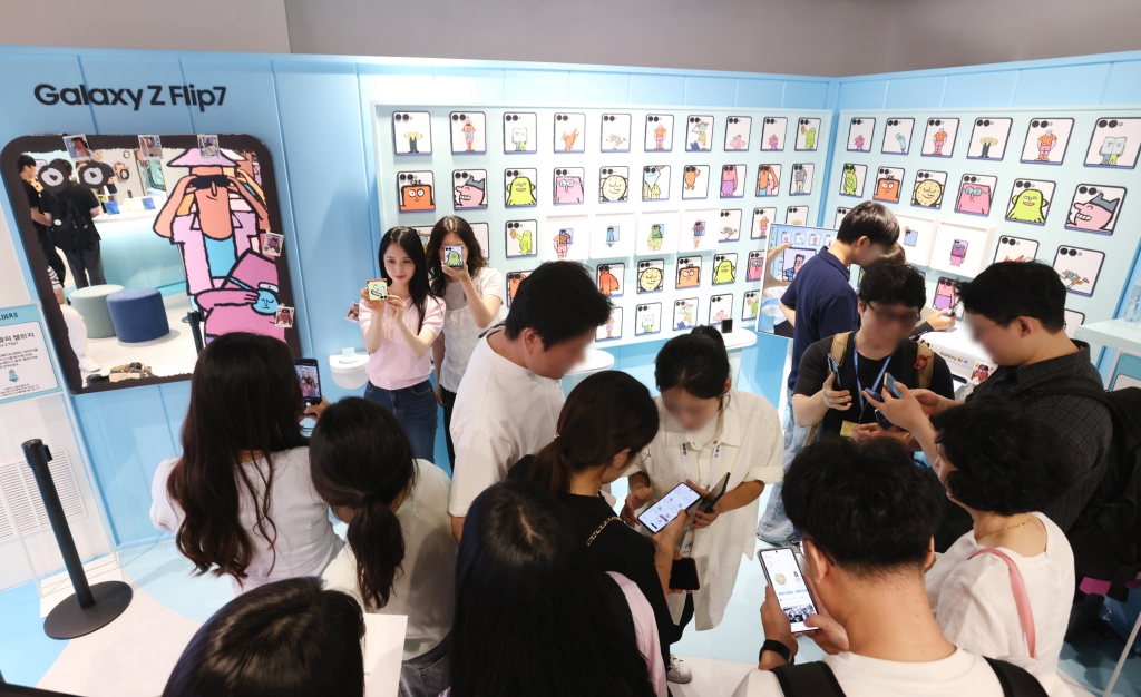 ▲ 서울 코엑스 ‘The Galaxy UNFOLDERS’ 체험존 방문객들이 ‘갤럭시 Z 폴드7’의 대화면과 ‘갤럭시 Z 플립7’의 커버 디스플레이를 활용해 ‘뉴페이스 셀피’를 촬영하는 모습