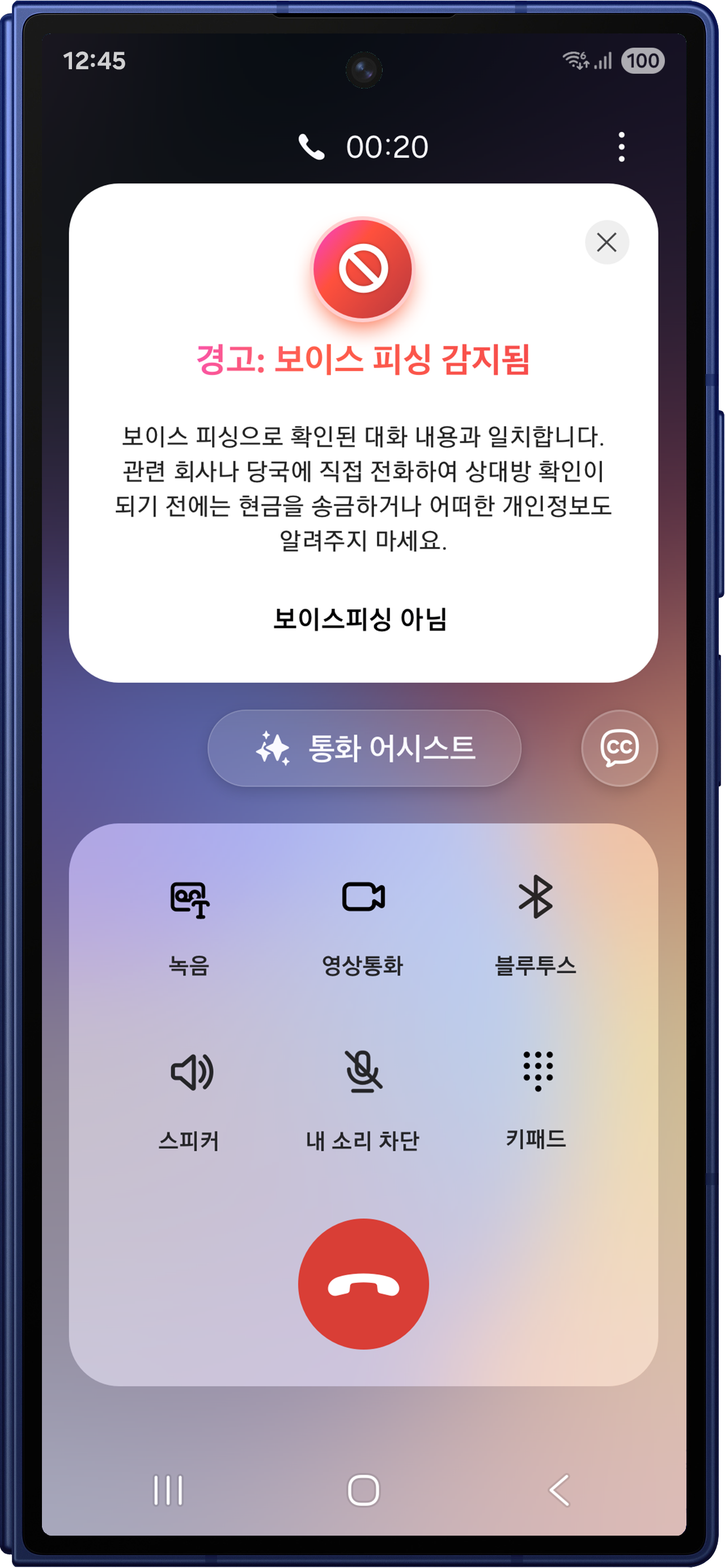 ▲ 갤럭시 스마트폰의 보이스피싱 의심, 경고 화면 이미지