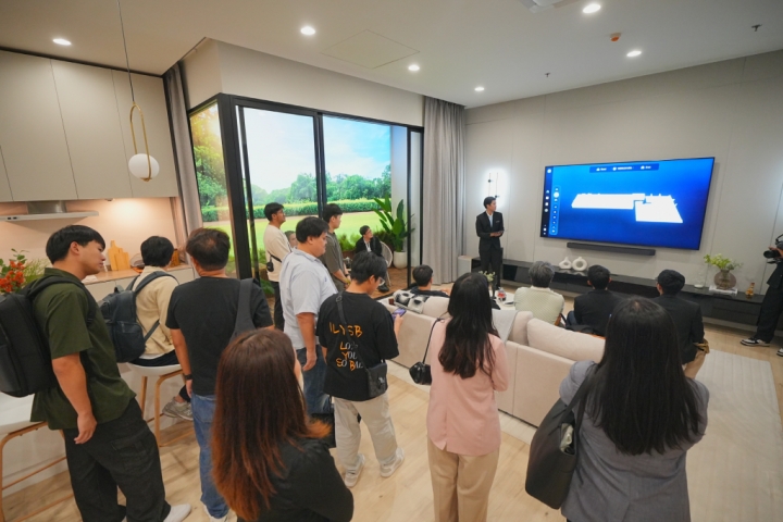 ▲ 태국 방콕에 위치한 삼성전자 비즈니스 익스피리언스 스튜디오(BES)를 찾은 방문객들이 ‘스마트홈’ 콘셉트의 전시 공간에서 스마트싱스로 연결돼 한층 쉽고 편리해진 개인 맞춤형 공간을 경험하고 있다.