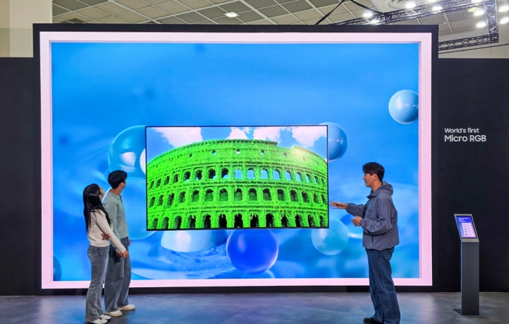 ▲ 서울 코엑스에서 열린 KES 2025(한국전자전) 삼성전자관에서 관람객들이 ‘마이크로 RGB TV’의 압도적 화질과 색 재현력, 명암 표현력 등을 경험하고 있다.