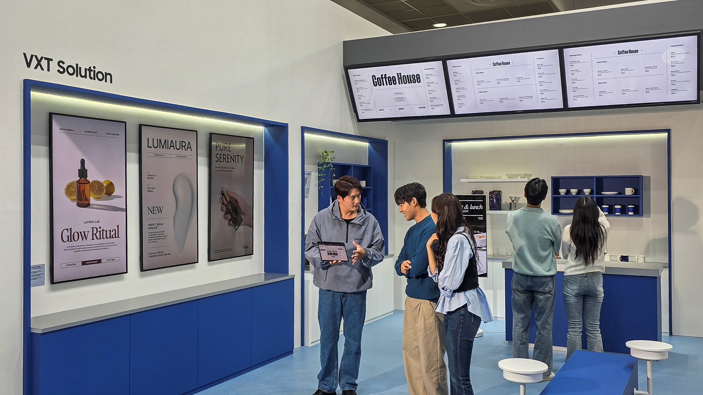▲ 서울 코엑스에서 열린 KES 2025(한국전자전) 삼성전자관의 상업 공간에서 프로모터가 원격으로 매장을 관리할 수 있는 VXT 솔루션을 소개하고 있다.