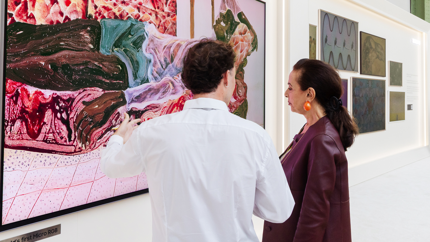 ▲ 관람객이 삼성 마이크로 RGB TV에 전시된 루도빅 은코스(Ludovic Nkoth)의 ‘하루의 무게(A Day’s Weight)’를 감상하고 있다.
