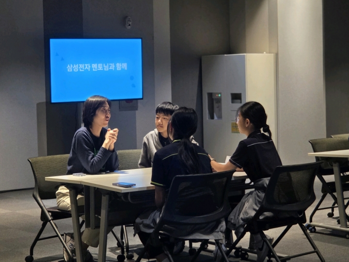 ▲ 삼성전자 임직원들이 11월 11일 사업장 견학을 위해 방문한 중학생들을 대상으로 멘토링 봉사활동을 진행했다.