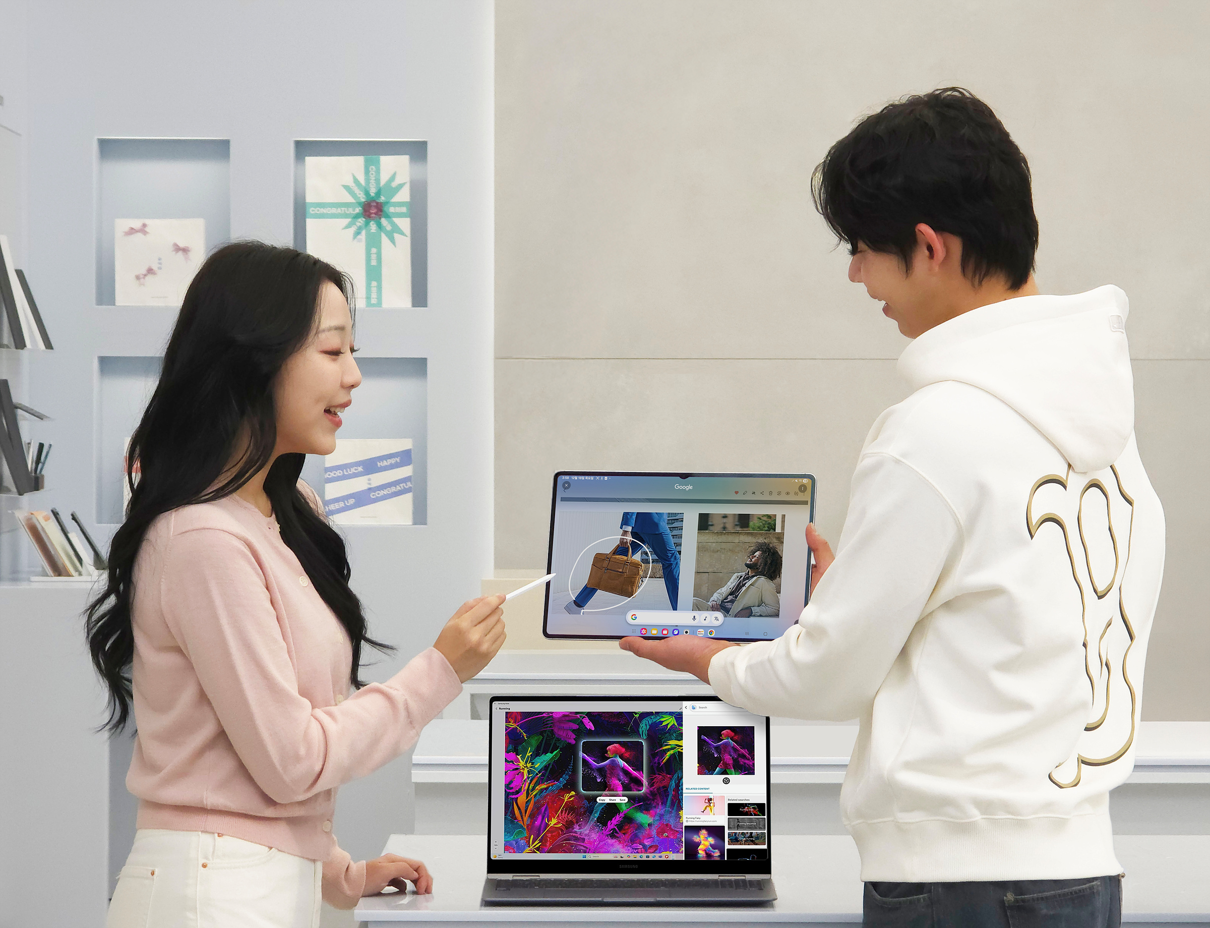 ▲ 삼성전자 모델이 ‘갤럭시 탭 S11 울트라’의 ‘서클 투 서치’ 기능과 ‘갤럭시 북5 프로’의 ‘AI 셀렉트’ 기능을 체험하는 모습