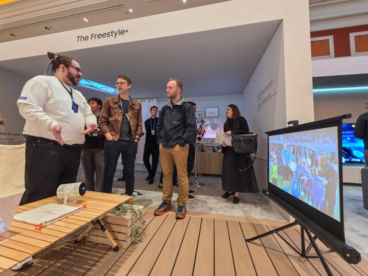 ▲ 관람객이 미국 라스베이거스에서 열리는 세계 최대 전자 전시회 ‘CES 2026’에 마련된 윈호텔 삼성전자 단독 전시관에서 ‘더 프리스타일+’를 구경하고 있다.