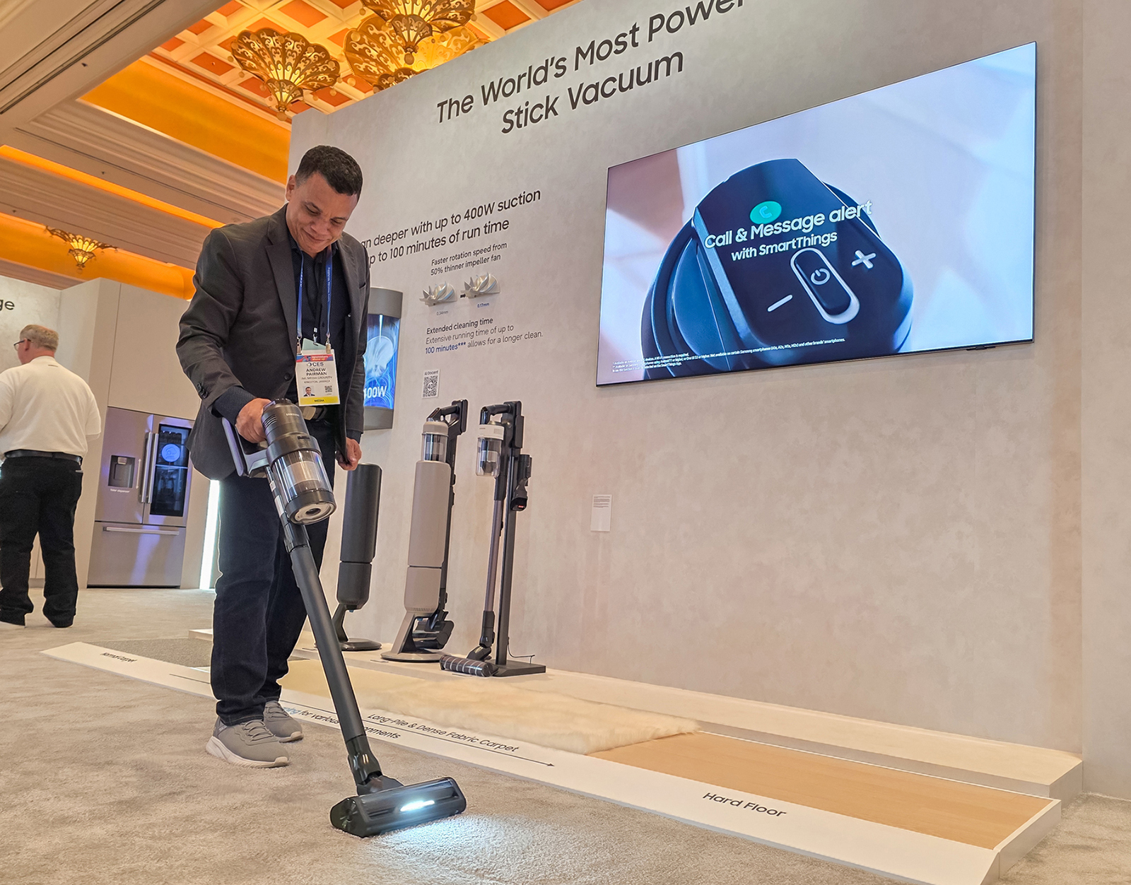 ▲ 관람객이 미국 라스베이거스에서 열리는 세계 최대 전자 전시회 ‘CES 2026’에 마련된 윈호텔 삼성전자 단독 전시관에서 ‘비스포크 AI 제트 400W’ 스틱 청소기를 체험하고 있다.