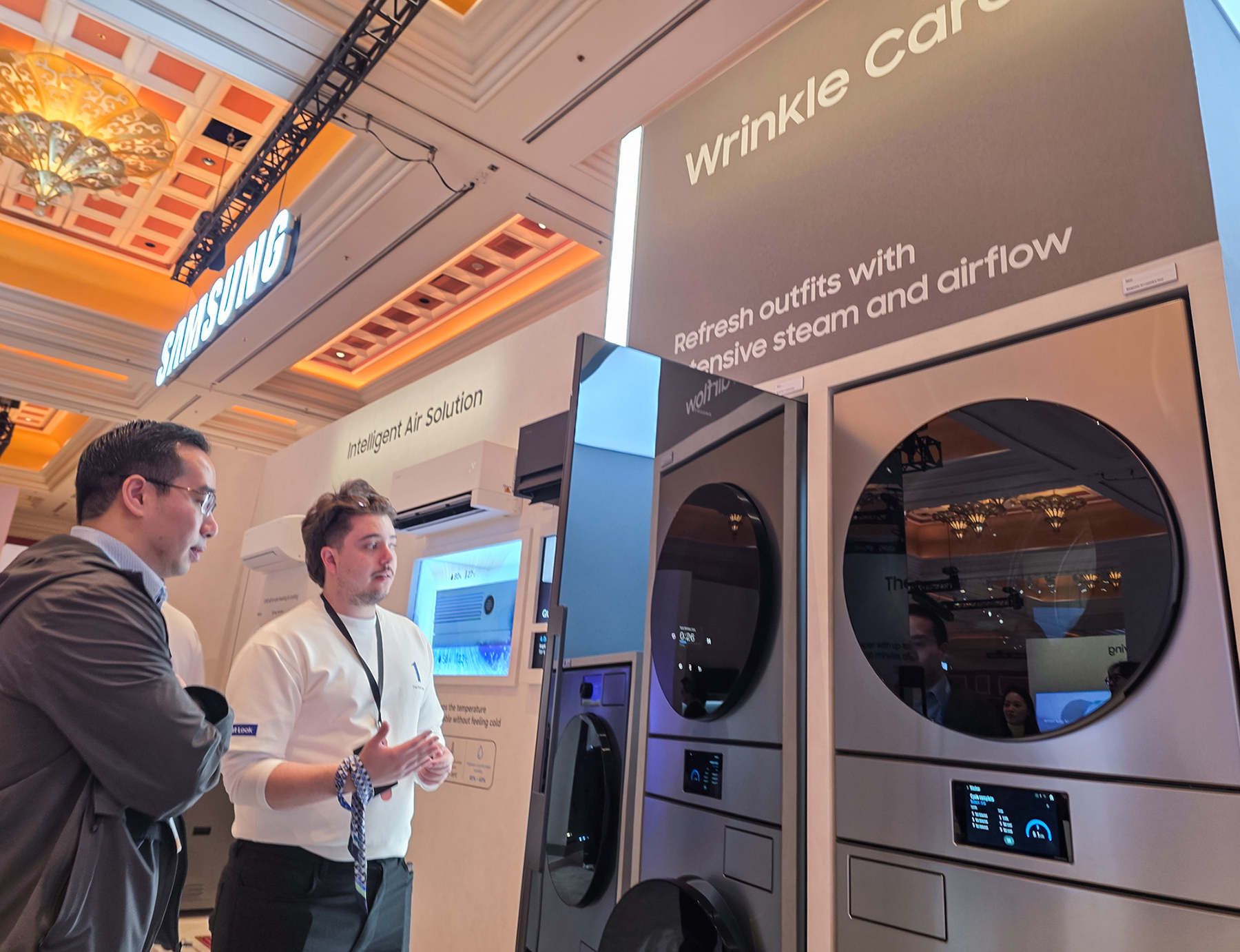 ▲ 관람객이 미국 라스베이거스에서 열리는 세계 최대 전자 전시회 ‘CES 2026’에 마련된 윈호텔 삼성전자 단독 전시관에서 ‘비스포크 AI 에어드레서’를 체험하고 있다.
