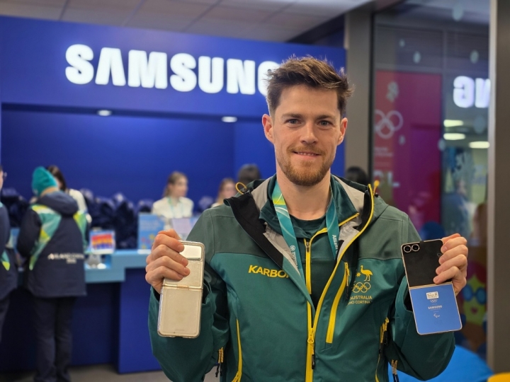 ▲ 브렌던 코리 (Brendan Corey / 호주, 스피드 스케이팅) 선수가 밀라노 올림픽 선수촌 내 삼성 체험관에 방문해 갤럭시 Z 플립7 올림픽 에디션과 지난 베이징 동계올림픽 갤럭시 Z 플립3 올림픽 에디션을 함께 보여주고 있다.