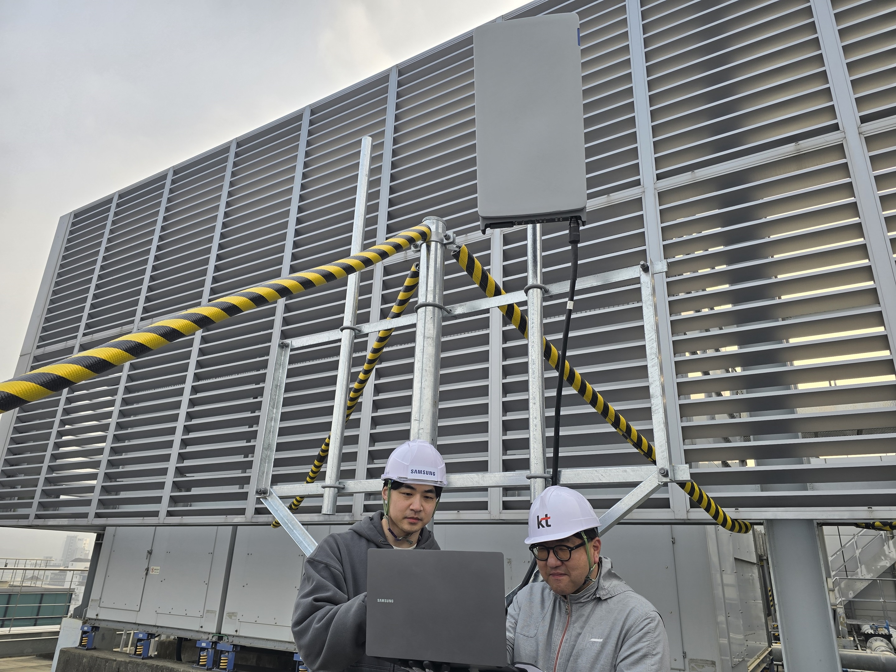 ▲ 삼성전자 차세대통신연구센터와 KT 연구진이 서울 우면동 소재 삼성전자 서울R&D캠퍼스에서 초고집적 다중 안테나 기술을 검증하고 있다.