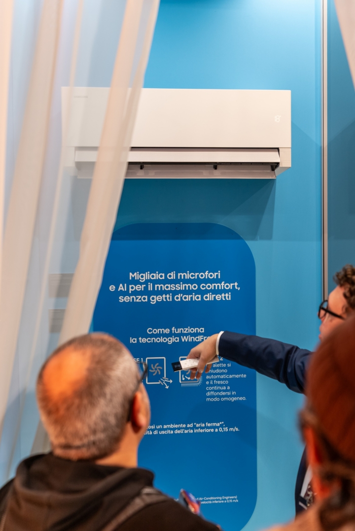 ▲ 24~27일 이탈리아 밀라노에서 열린 MCE 2026에서 삼성전자 직원이 참석자들에게 수상 제품의 특장점을 소개하고 있다. ‘AI 무풍콤보 프로 벽걸이’ 가정용 에어컨 이미지