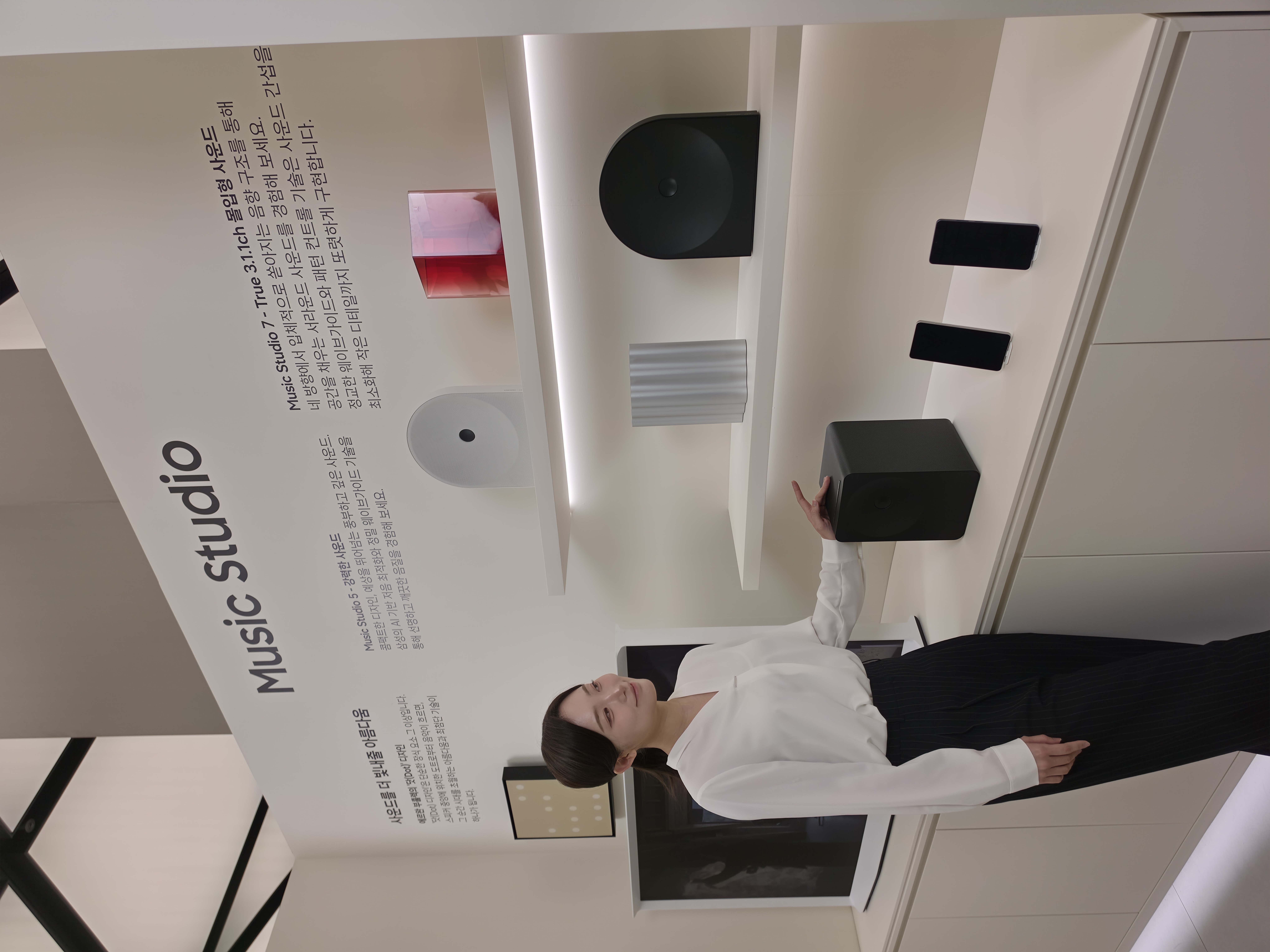 ▲ 삼성전자 모델이 감각적인 디자인의 ‘뮤직 스튜디오 7’로 풍부한 사운드를 체험하고 있다.