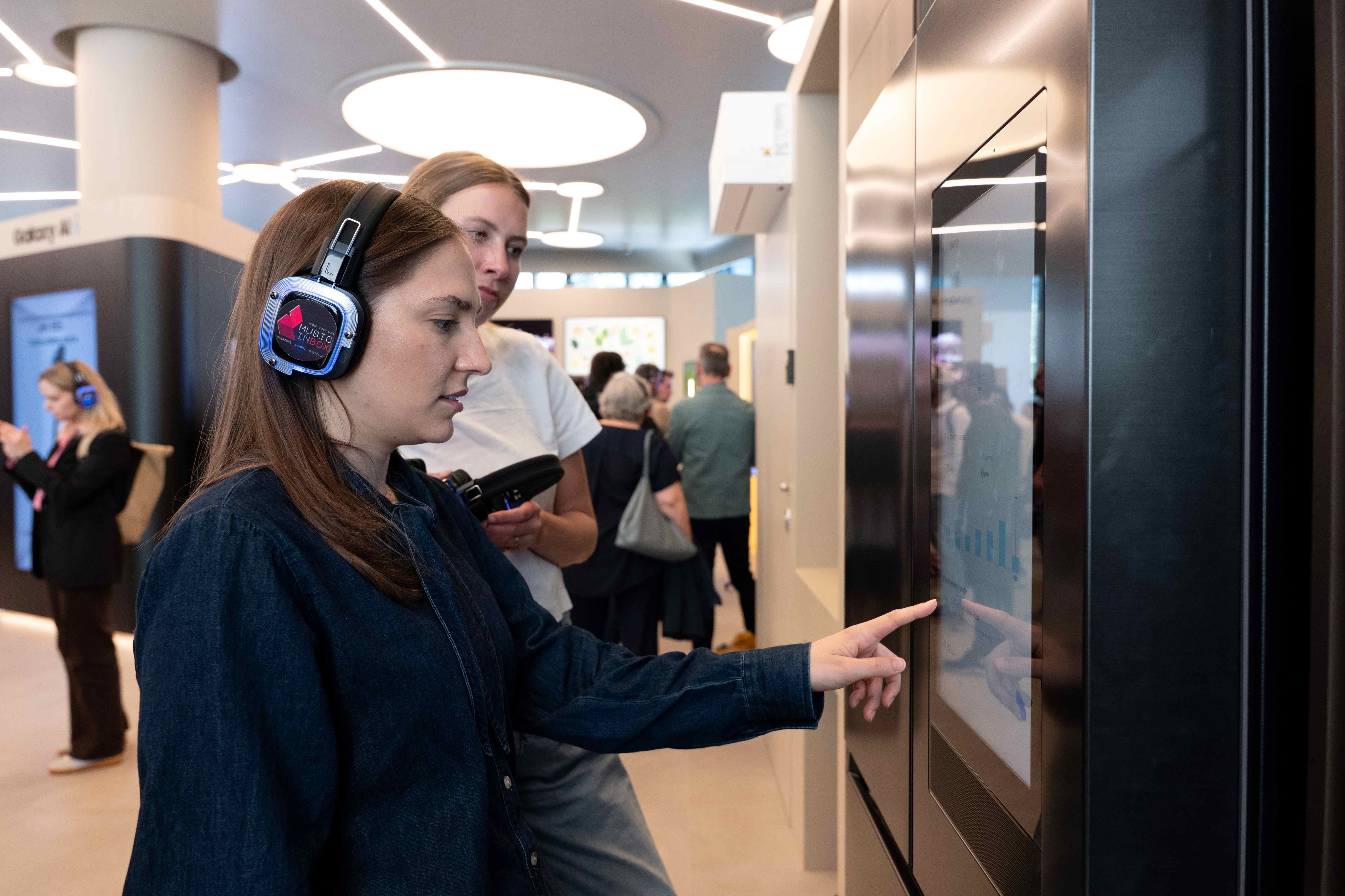 ▲ 21일(현지 시간) 이탈리아 밀라노에서 열린 삼성전자 가전 기술 세미나 ‘더 브리프 밀란’에서 참석자들이 ‘비스포크 AI 패밀리허브’ 냉장고를 체험하고 있다.