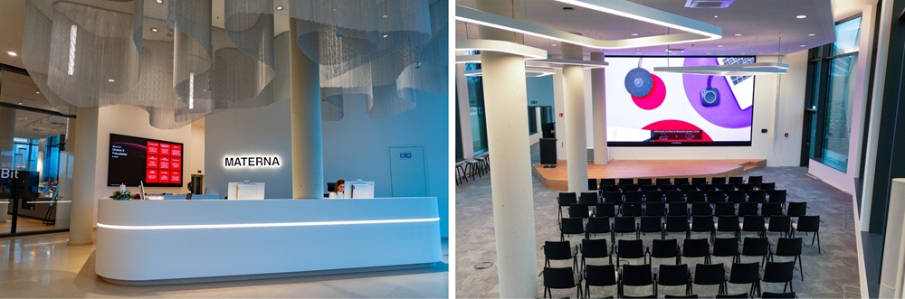 ▲ Materna utiliza pantallas Samsung para crear recepciones acogedoras (izquierda) y espacios de presentación dinámicos (derecha) que favorecen la colaboración y la participación de los clientes.