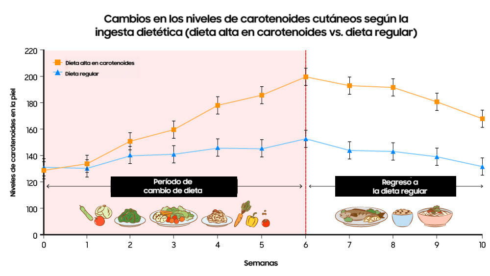 Un estudio de intervención alimentaria realizado por la Escuela de Salud Pública de la Universidad Nacional de Seúl (SNU) confirmó que los niveles de carotenoides en la piel reflejan de manera confiable la ingesta de frutas y verduras. “Durante seis semanas, proporcionamos comidas con diferentes contenidos de carotenoides a 80 participantes y observamos que sus niveles cutáneos aumentaban en una o dos semanas”, dijo Joung.